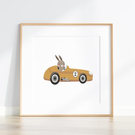 Bring fun, colour, and imagination to your little one’s room with this delightful set of 3 printed animal racing car art prints. Featuring a bunny, giraffe, and horse behind the wheels of vintage race cars, this boys’ wall art trio is designed to spark joy and adventure.