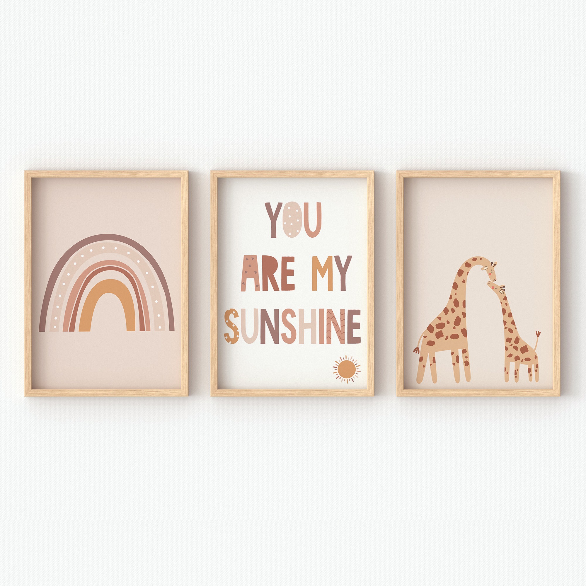 Neutral Boys Nursery Wall Art Set of 3 Prints Giraffe, Rainbow & “You Are My Sunshine” in Earthy Tones