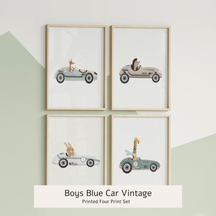 Printed on premium 250gsm matte paper, these high-quality, unframed prints add a soft vintage touch with tones of blue, beige, and natural wood accents. Perfect for above the bed, in a playroom, or as a unique gift for young car enthusiasts.